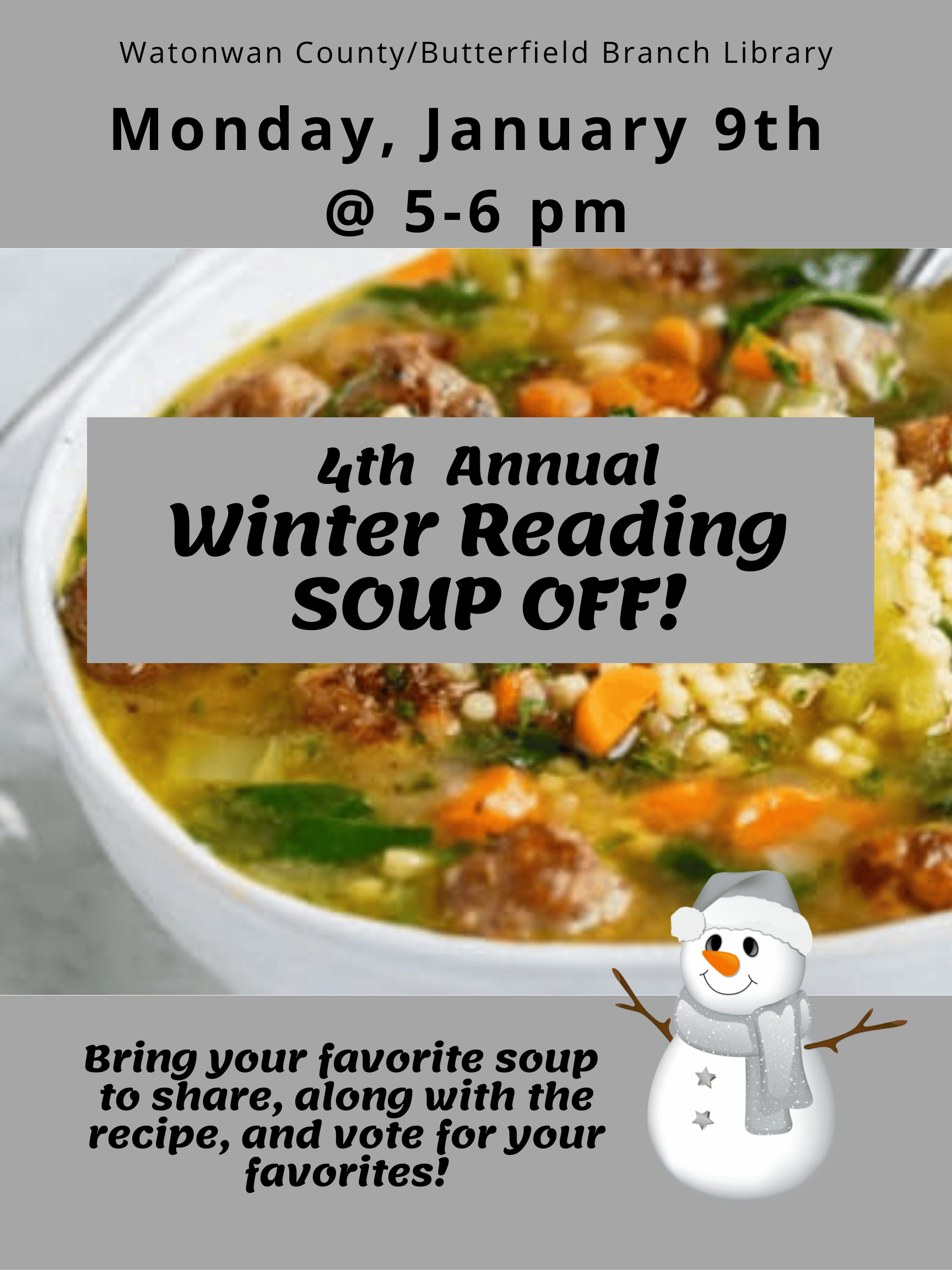 To kick off the winter reading program, let’s do a soup potluck! Bring in your favorite soup to share, along with the recipe, and then vote for your favorite.